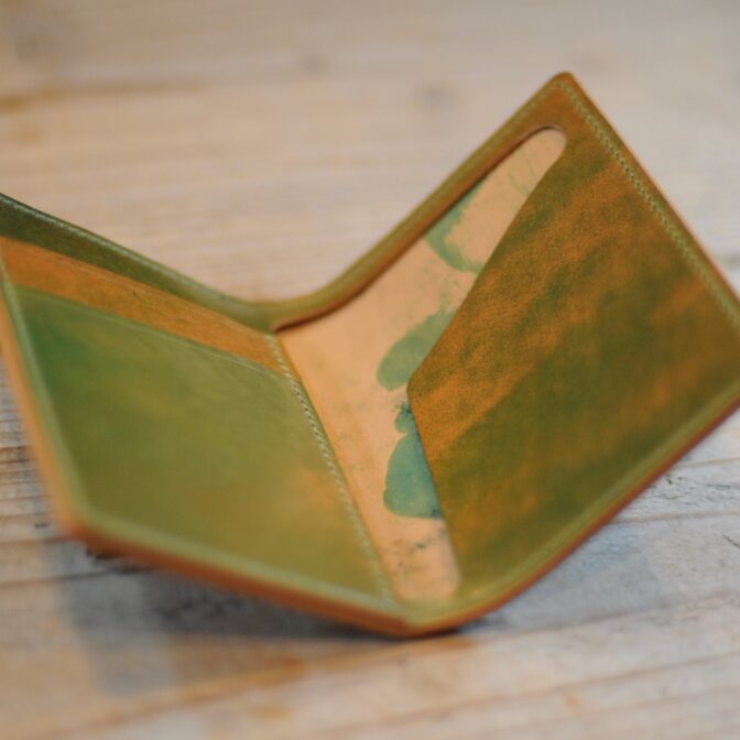 染色の難しいコードバンを個性的なマーブル色に染め、この商品となりました。