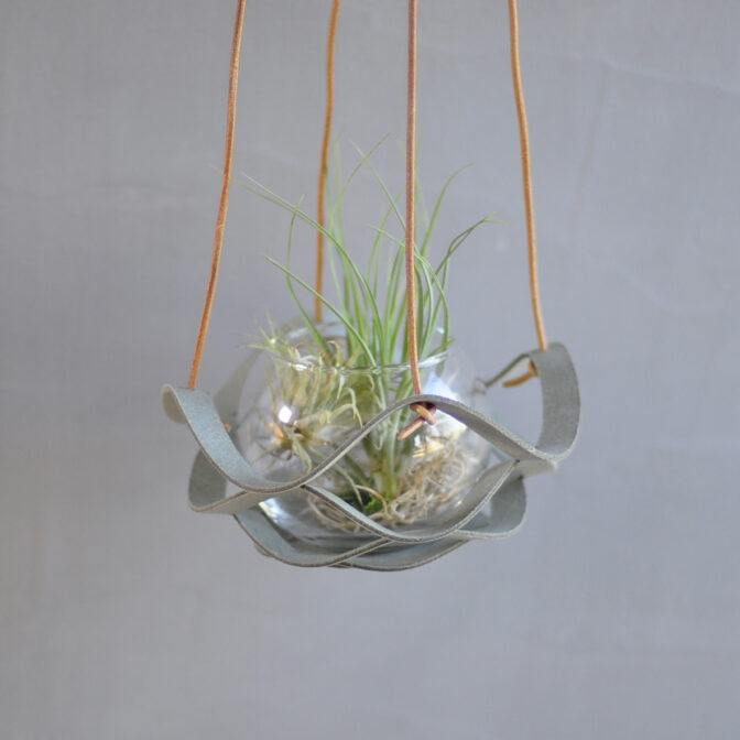 植物ハンガー(attaluca)は直径18cmの円の革を蛇腹状に伸ばしています。