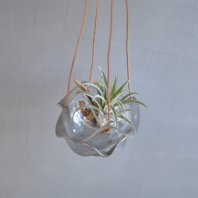 植物ハンガー(attaluca)は直径18cmの円の革を蛇腹状に伸ばしています。